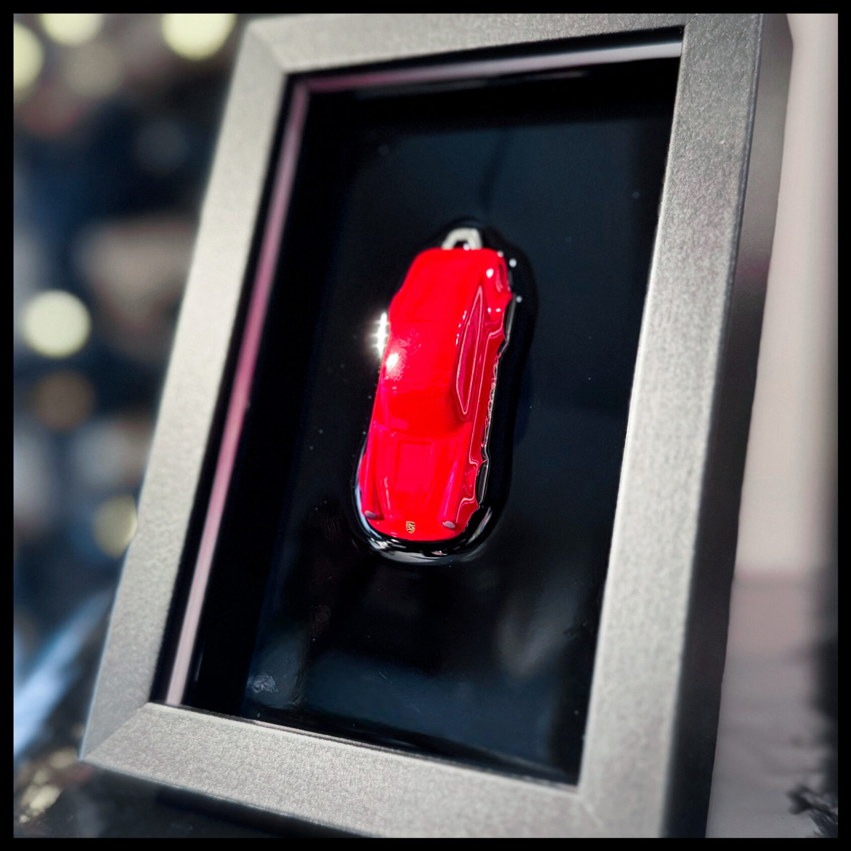 Dieser exklusiv veredelte Hot Wheels Porsche 911 (Größe 1:64 – Carrera Clip Experimotors-2025) ist ein Sammlerstück, das Design, Handwerkskunst und automobilen Charakter auf kleinstem Raum vereint. Das ikonische Modell wurde in einen tiefen, mattschwarzen Rahmen (16,1 x 11,1 cm) eingesetzt und dauerhaft in schwarzem Resin fixiert. Durch die glänzende Oberfläche entsteht ein faszinierender Tiefenspiegel-Effekt, der das Fahrzeug optisch schweben lässt und den typischen 911er-Look eindrucksvoll betont.